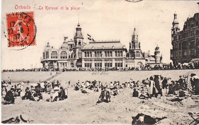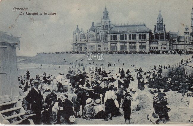 Ed. V.G. [=Victor Grégoire], 42, avenue du midi, Bruxelles - Ostende - Le Kursaal. - De westelijke gevel van het derde Kursaal langs de Zeedijk. Links, strandrecreatie op het Groot Strand