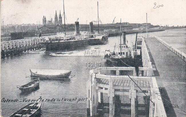 Victor Grégoire/V.G. - Ostende - Vue sur la rade ou l'avant port. De haven, met zicht op het centrum van de stad en de torens van de Sint-Petrus- en -Pauluskerk. Een raderstoomboot van de Oostende Doverlijn…