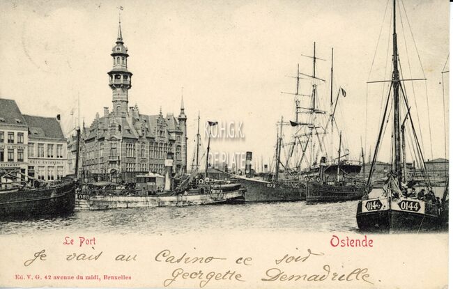 Victor Grégoire/V.G. - Ostende - Le port. Het Zeevaartcommissariaat of pilotage op de hoek van de Keizerskaai en de Zuidstraat. Vissersvaartuigen in het eerste handelsdok