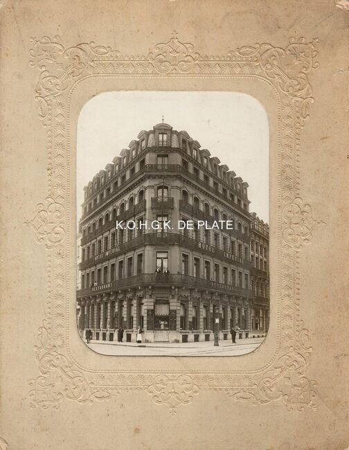 Formaat : 15,5 x 11,5 cm. - Enkele personeelsleden staat op het balkon en voor het hotel te poseren. Op de hoek in de Van Iseghemlaan staat een straatlantaarn met het bord voor een tramhalte.