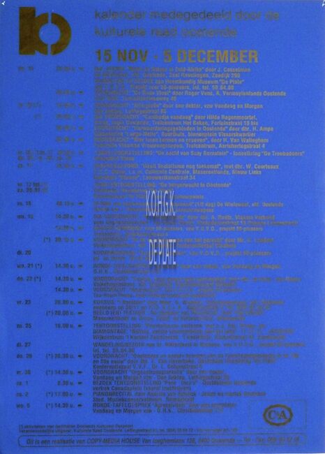 Affiche : Kulturele Raad Oostende. Kalender. 15 november tot 5 december ....(?)