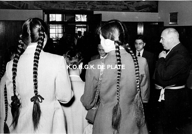 Formaat : 13 x 18 cm. - Plechtige ontvangst op het dienstdoend stadhuis (gerechtshof). Rechts, schepen Maurice Quaghebeur sr.