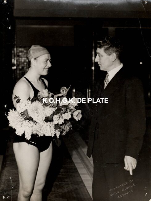 Formaat : 13 x 18 cm. - De genodigden op zaterdag 06/08/1955 voor de uitreiking van de Feminaprijs voor de Film 1955 in het Kursaal. Bij hun aankomst herkennen we : mevrouw Van Glabbeke en de gouverneur van de Provincie…