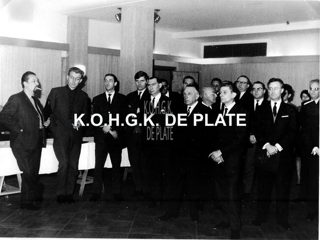 Formaat : 18 x 24 cm. - Van links naar rechts ; Emilien Michiels, directeur van de kursaal, de president van Kameroen, Jan Piers, minister-staatssecretaris Openbaar Ambt en Toerisme en John Lauwereins, waarnemend…