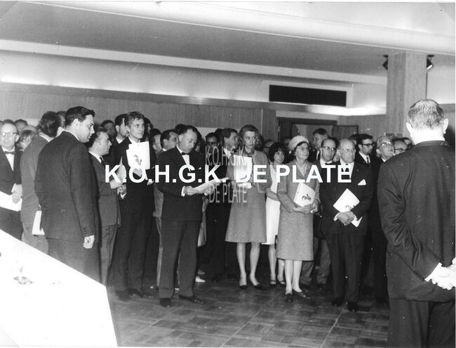 Formaat : 12,5 x 18 cm. - Waarnemend burgemeester John Lauwereins houdt zijn toespraak. Naast hem, Roger De Ramée, directeur van de kursaal en mevrouw Hélène Troupin, directrice personeel kursaal