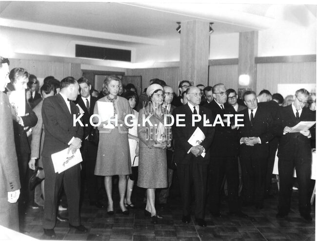 Formaat : 18 x 24 cm. - De president bij zijn aankomst.Links, drie personeelsleden van het casino-kursaal, Emilien Micheiels, directeur van de kursaal, de president van Kameroen, Jan Piers in gesprek en waarnemend…