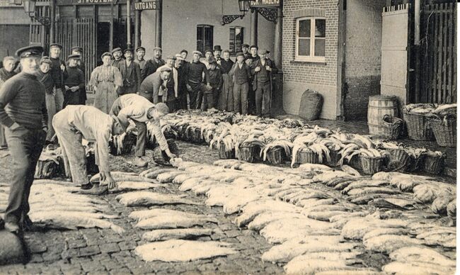 Nels Ostende, 98. - Ostende Le marché aux poissons. De kleine vis werd in manden gerangschikt voor de verkoop, terwijl de grote vis, zoals kabeljauw op de grond werd gelegd.