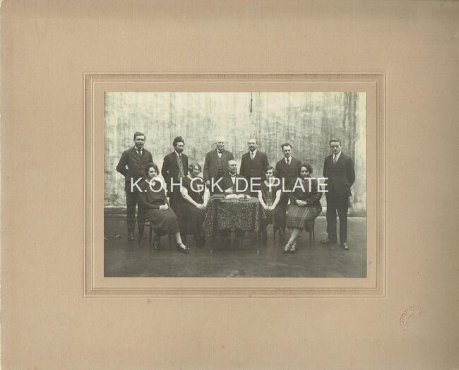 Formaat : 12 x 17 cm. - Herinnering aan de Van Nesteschool in de Schippersstraat . Directeur Valentin Dekeyser (zittend in het midden), Staand: Leraren Coron - Robert Patfoort - H. Degraeve - H. Cambron - S. Derock -…