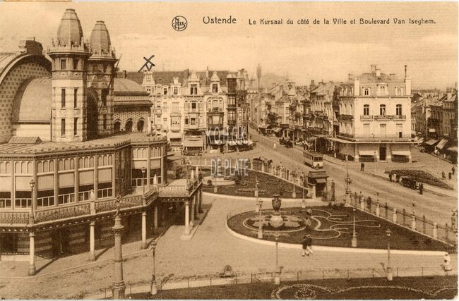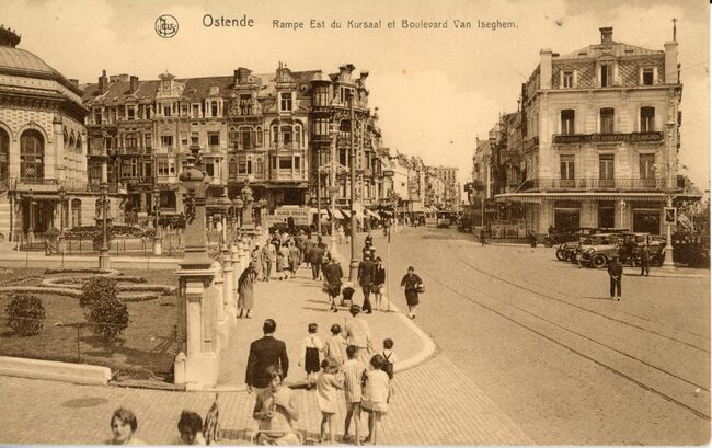 Nels/Thill série 13, 93. - Ostende - Rampe Est du Kursaal et Boulevard. - De Van Iseghemlaan. Links, de hovingen van het derde Kursaal. Wat verder op de hoek met de Kursaal-Oosthelling, staat een vrachtwagen en een kar…