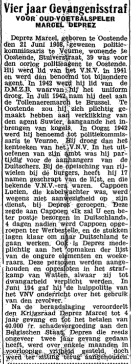 Trefwoorden COLLABORATIE ; TWEEDE WERELDOORLOG DEPREZ MARCEL (°1908-) (POLITIEAGENT VOETBALLER) POLITIE ; PERSONEEL Plaatskenmerk O.D.P.-archieven. Bibliotheek Kris Lambert KBOD1946 19-09-1946 Bron De Kustbode Pagina's 1 Print