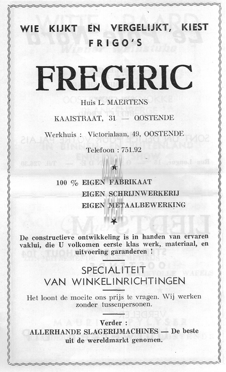 Advertentie : Firgo's FREGIRIC. Huis L. Maertens. Kaaistraat 31, Oostende