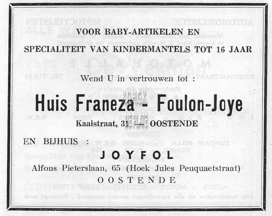 Advertentie : Huis Franeza-Foulon-Joye. Baby- en kinderkleding. Kaaistraat 31, Oostende