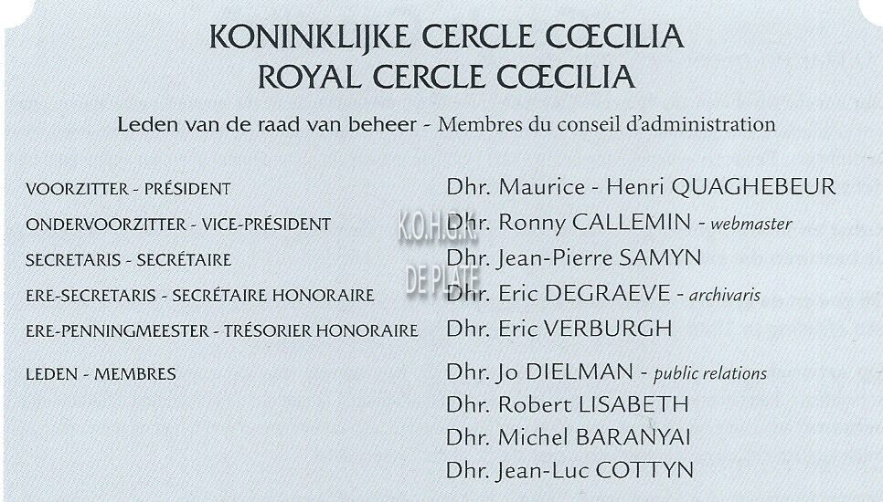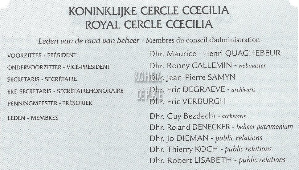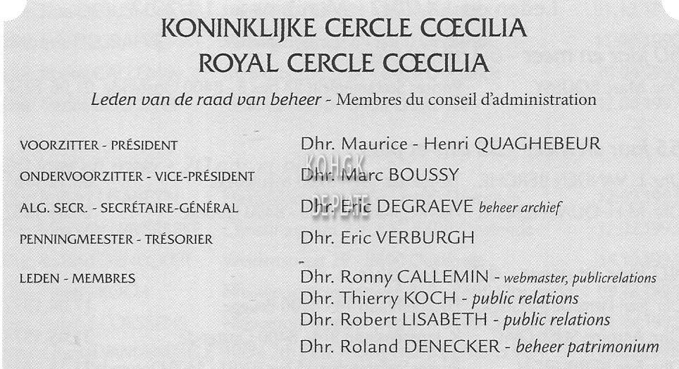 KONINKLIJKE CERCLE COECILIA (SOCIO-CULTURELE VERENIGING)QUAGHEBEUR MAURICE HENRI (1940) (NOTARIS SCHEPEN)DEGRAEVE ERIC (MEDISCH VERTEGENWOORDIGER)LISABETH ROBERT (BANKDIRECTEUR)BOUSSY MARCVERBURGH ERIC (INSPECTEUR)CALLEMIN RONNY (TECHNISCH DIRECTEUR PETRUS EN PAULUS WEST)KOCH THIERRY (ZAAKVOERDER)DENECKER ROLAND (AMBTENAAR)