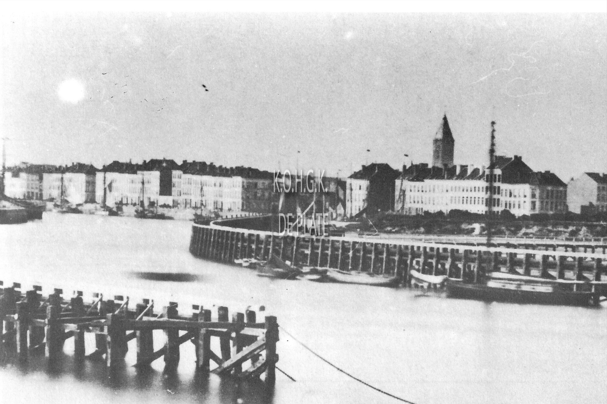 Foto : De Visserskaai, vanaf de Nieuwstraat tot aan de Langestraat (1880). - Met de havengeul en staketsel en helemaal rechts een gedeelte van de Anglicaanse kerk. Vanaf daar liep een brug over het klein strand tot aan het westerstaketsel