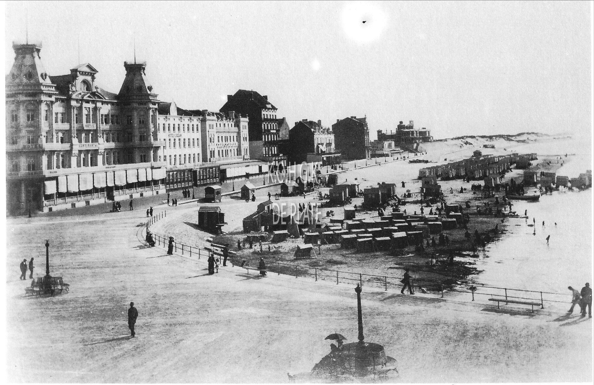 Foto : Dijk en strand (1875). - Centraal het Pavillon Beerblock, geopend in 1852, gesloopt in 1879 ; rechts het Pavillon du Rhin, geopend in 1857, gesloopt in 1892, uitgebaat door Louis Royon-Hertoghe. - Op de voorgrond het strand en badkarren