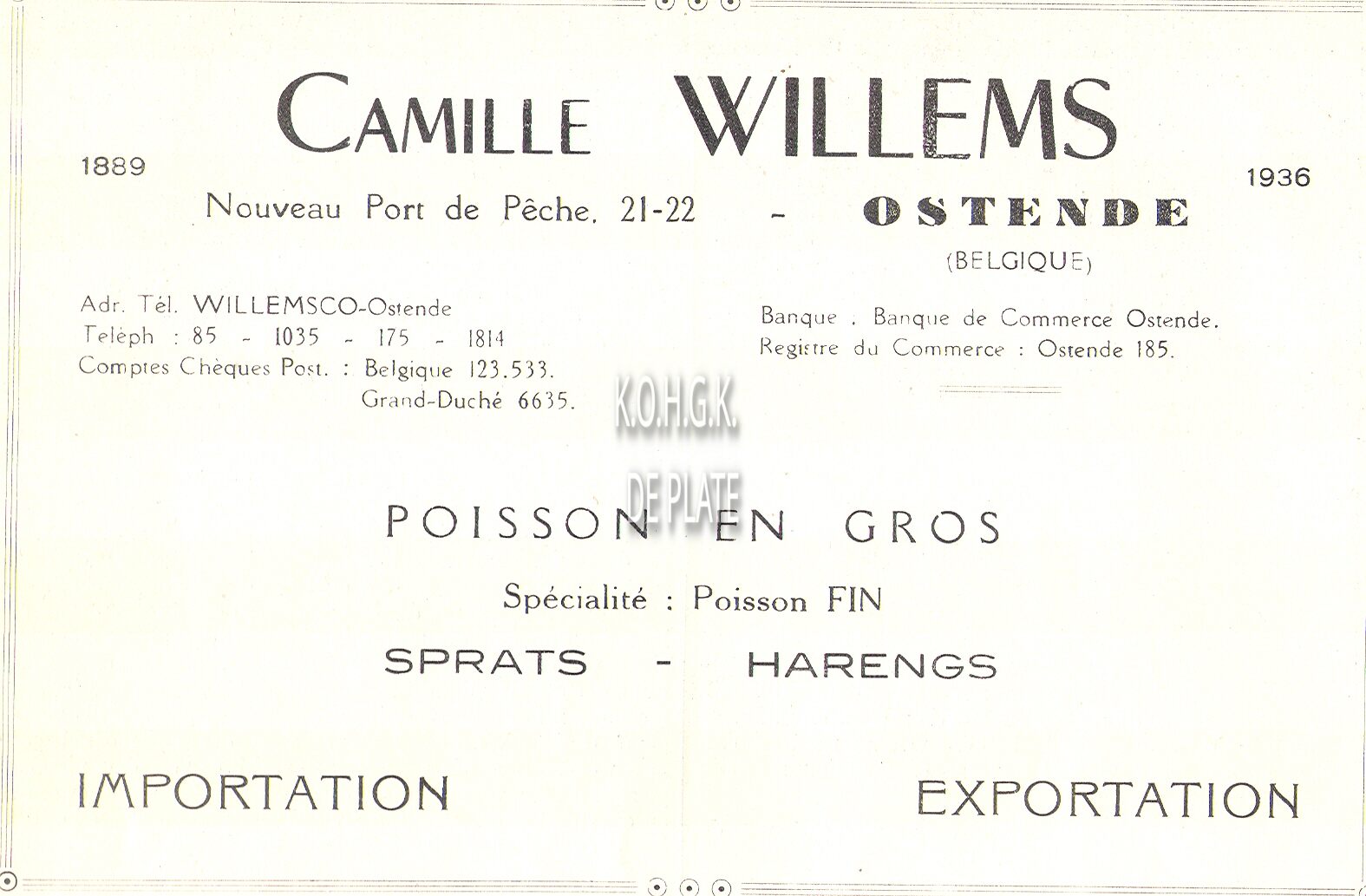 Spécialité des Huitres d'Ostende. Homards vivants. Importation. Exportation.