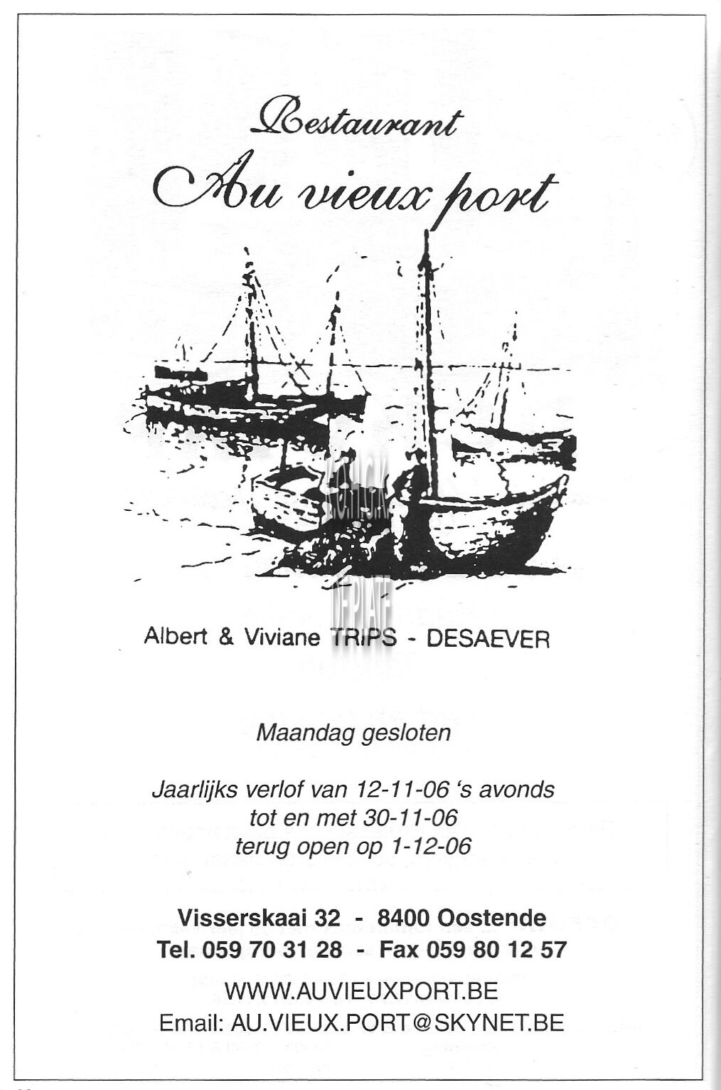 Trefwoorden ADVERTENTIES ; HORECAAU VIEUX PORT (RESTAURANT)TRIPS ALBERT (RESTAURANTHOUDER)DESAEVER VIVIANE (RESTAURANTHOUDSTER)VISSERSKAAI