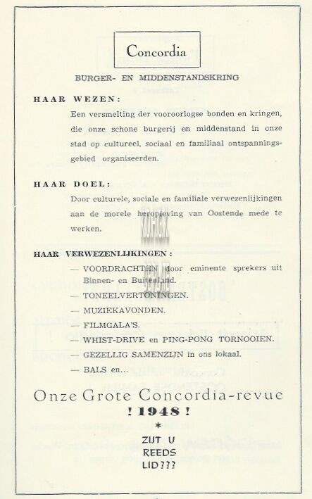 Trefwoorden KONINKLIJKE SCHOUWBURG (VAN ISEGHEMLAAN) ; PROGRAMMA'SKONINKLIJKE SCHOUWBURG (VAN ISEGHEMLAAN) ; EVENEMENTENOOSTENDSE PLATEN OP ZWIER (REVUE)OOSTENDSE REVUESCONCORDIA (SOCIO- CULTURELE VERENIGING)