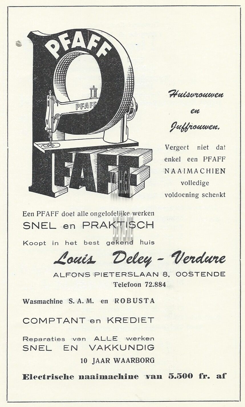Advertentie : Pfaff. Louis Deley-Verdure. Afons Pieterslaan 8, Oostende