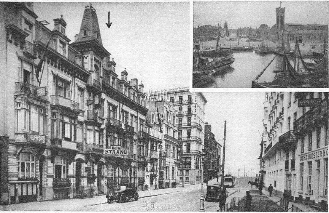Het hotel, links met pijl. Op de voorgrond, het oorlogsmonument voor de burgerlijke en militaire Oostendse slachtoffers van de Eerste Wereldoorlog.