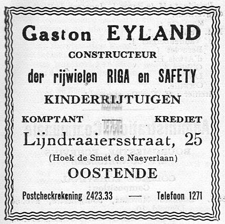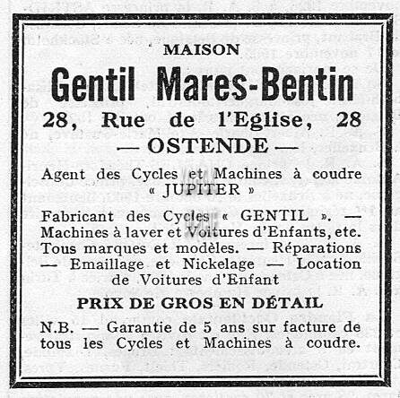 Agent des Cycles et Machines à coudre "Jupiter". Fabricant des Cycles "Gentil". Machines à laver et Voitures d'Enfants, etc. Tous marques et modèles. Réparations. Emaillage et Nickelage. Location de Voitures d'Enfants. Prix de gros en détail. N.B. - Garantie de 5 ans sur facture de tous les Cycles et Machines à coudre.
