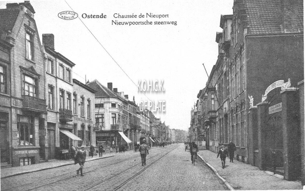 De noordkant van de Nieuwpoortsesteenweg ter hoogte van de Sint Jozefskliniek, richting Petit Paris. Uiterst rechts op de foto, de ingang van het Sint Vincentius Ferrerius wezenhuis.