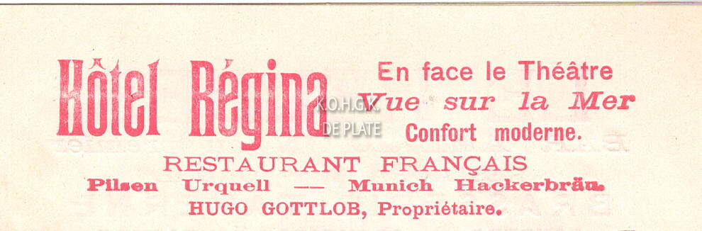 En face le Théâtre. Vue sur la Mer. Confort moderne. Restaurant Français. Pilsen Urquell, Munich Hackerbräu. Hugo Gottlob, propriétaire. - Map 015 D-16