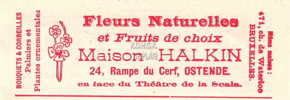 Advertentie : Maison Halkin. Fleurs naturelles et fruits de choix. 24, Rampe du Cerf, Ostende