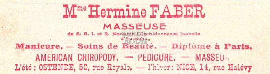 Advertentie : Mme Hermine Faber. Masseuse. L'été : 50, rue Royale, Ostende