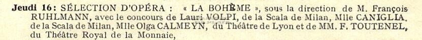 sous la direction de François Ruhlmann, avec le concours de Lauri Volpi, de la Scala de Milan ; Mlle Caniglia, de la Scala de Milan : Mlle Olga Calmeyn, du Théâtre de Lyon et de MM. F. Toutenel, du Théâtre Royal de la Monnaie.