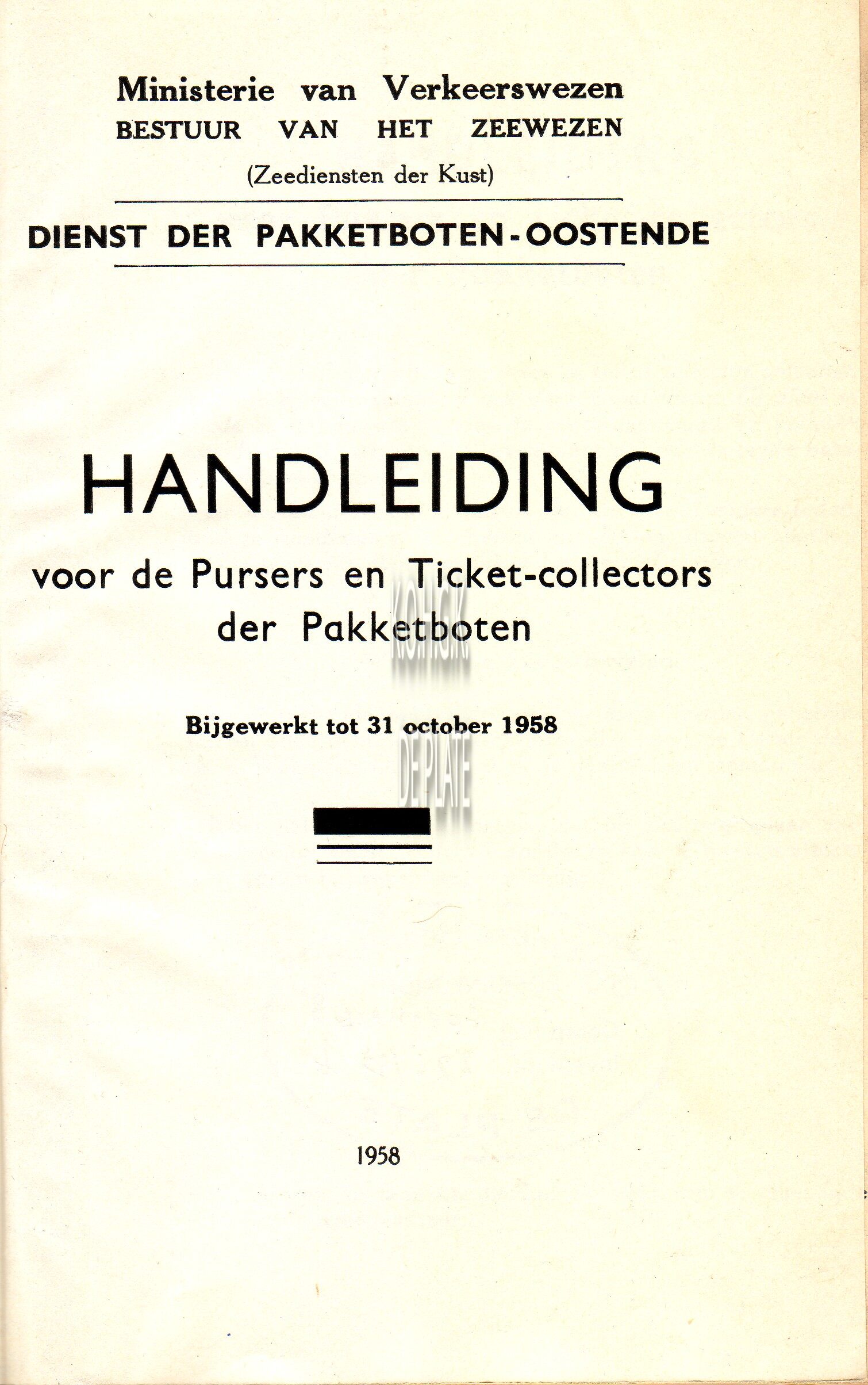Ministerie van verkeerswezen bestuur van het zeewezen (zeediensten der kust) dienst der pakketboten-Oostende.Handleiding voor Pursers en Ticket-collectors der pakketboten.