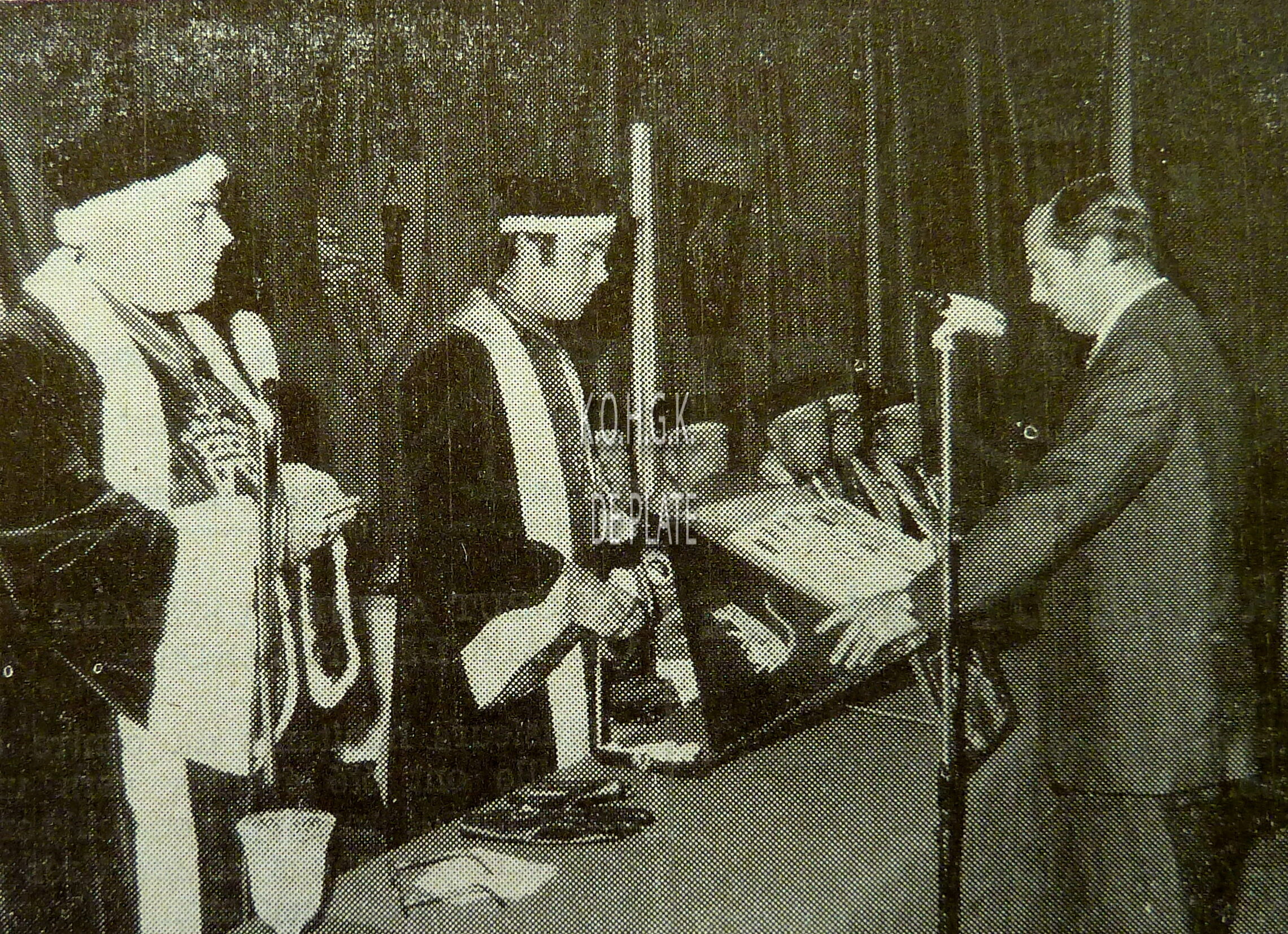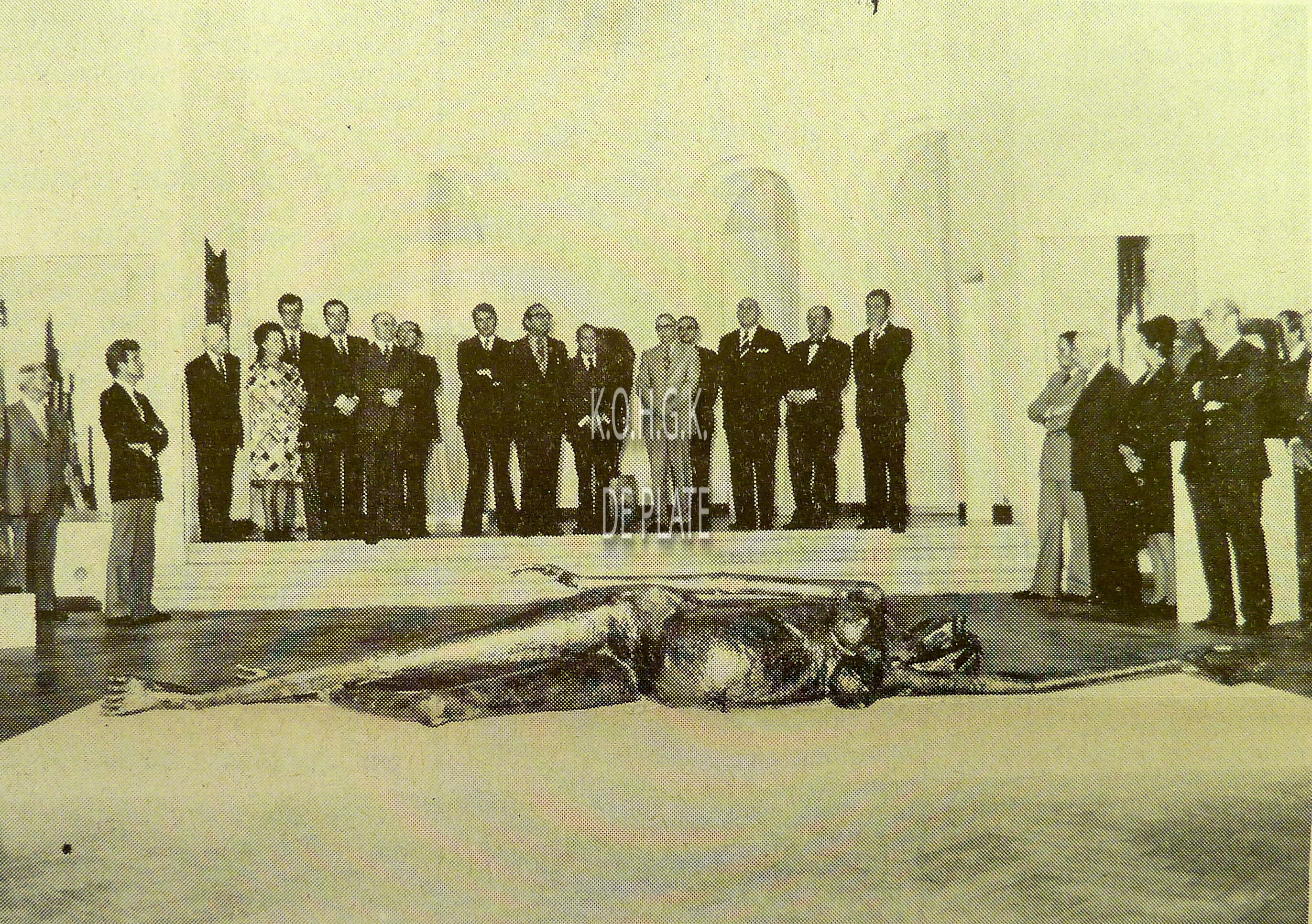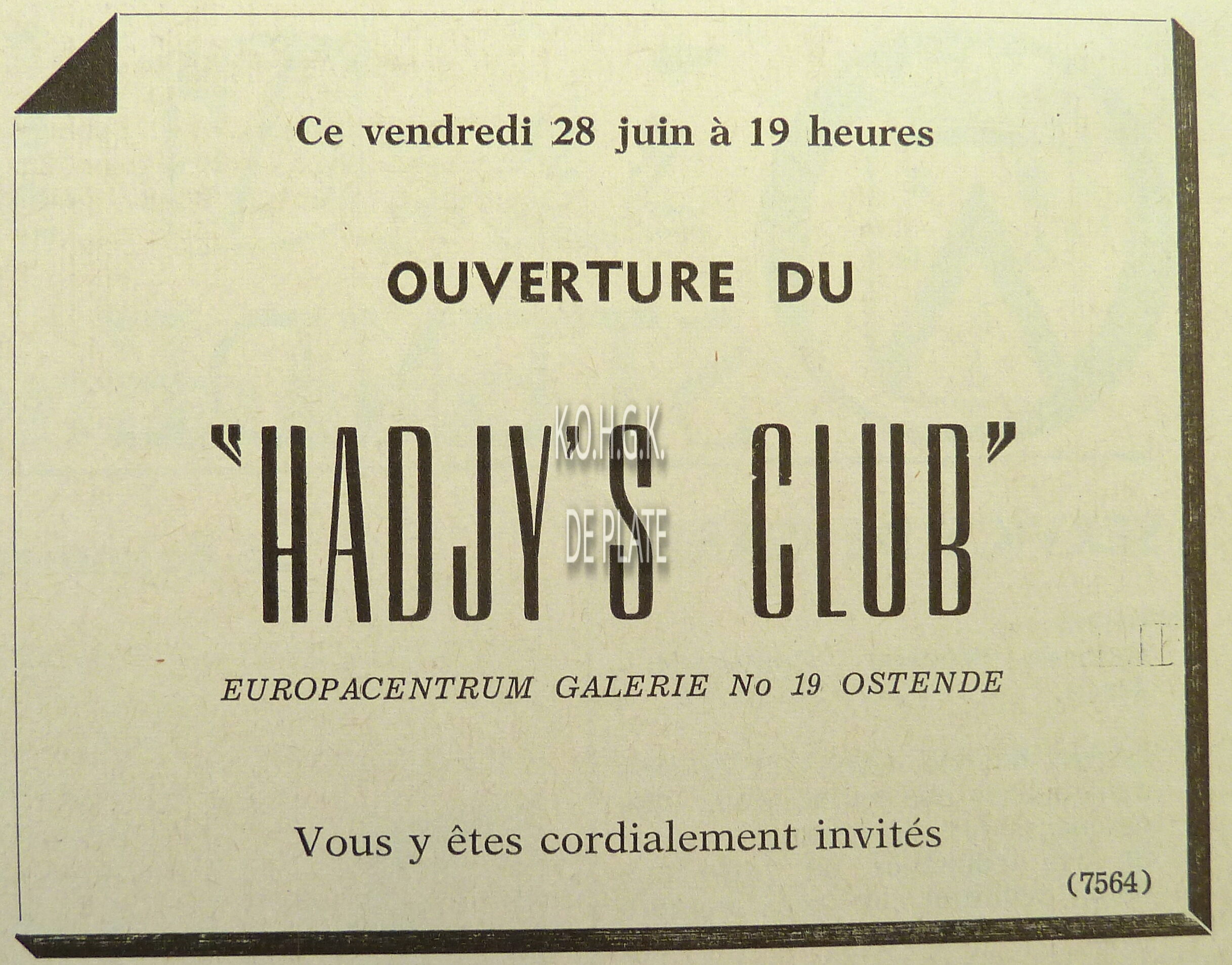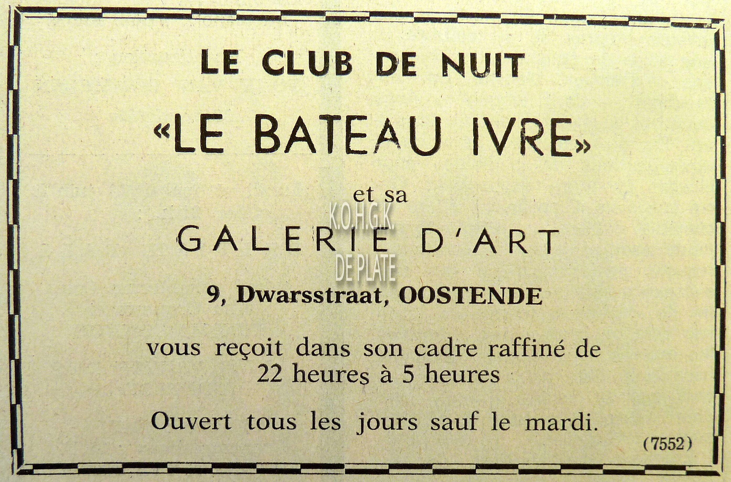 2 foto's : (1) In de ridderzaal van het Casino-Kursaal. De nieuwe ridders, op de eerste rij, van links naar rechts, de heren Jules Daveluy, Luc De Bailly, de Pesseroy, A. Deroux, Emile George en Cdt. Gordts. Op de tweede rij, van links naar rechts, de heren A. Jacquemart, H. Lommerzheim, W. Moortgat, R. Rowan, Achille Vandenberghe en Wilfried Vermast en (2) intronisatie van de heer H. Lommerzheim. Links, Maurice Quaghebeur sr.
