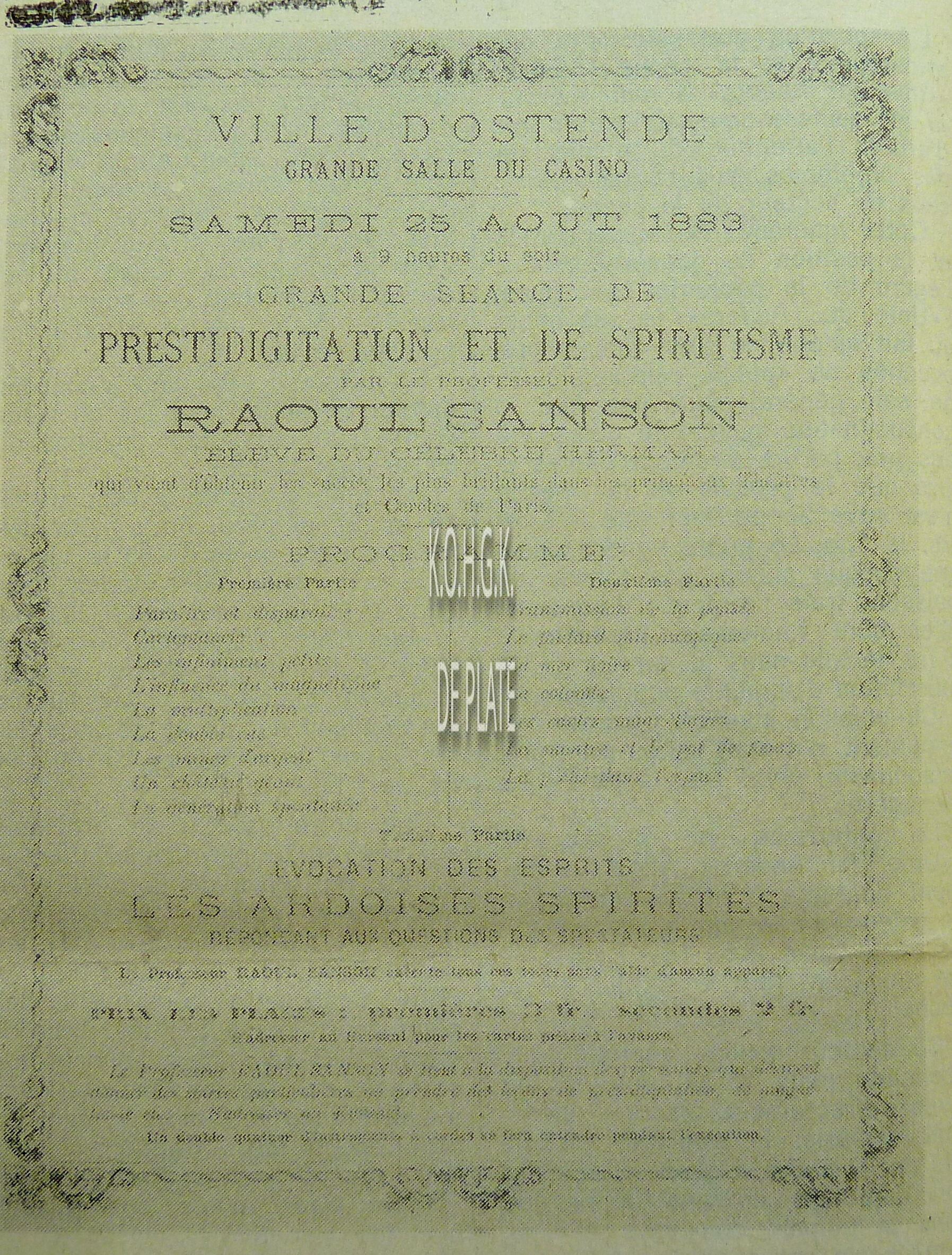 Ill. : Affiche : Ville d'Ostende. Grande salle du Casino. Grande séance de prestidigitation et de spiritisme. Raoul Sanson. 25/08/1883