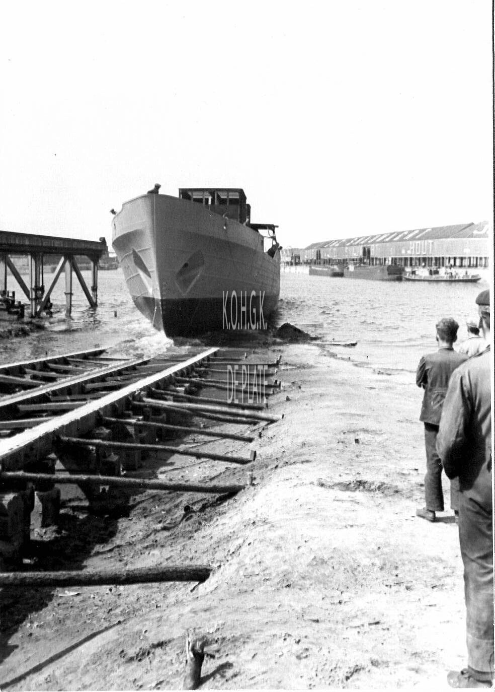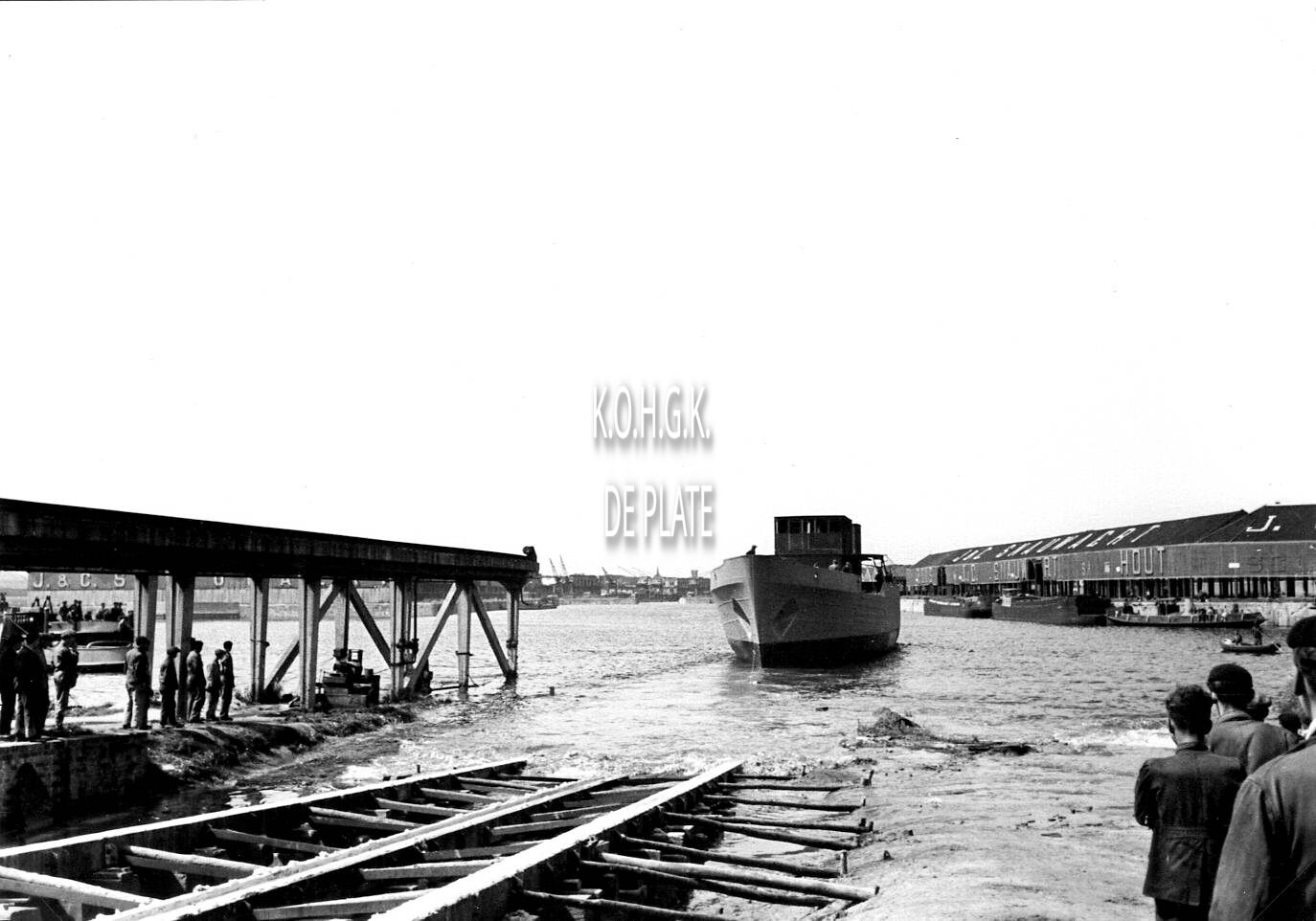 Stapelloop van een "Vorpostenboot" voor de Kriegsmarine. Op de achtergrond, de houthandel Snauwaert. - coll. Bundesarchiv)