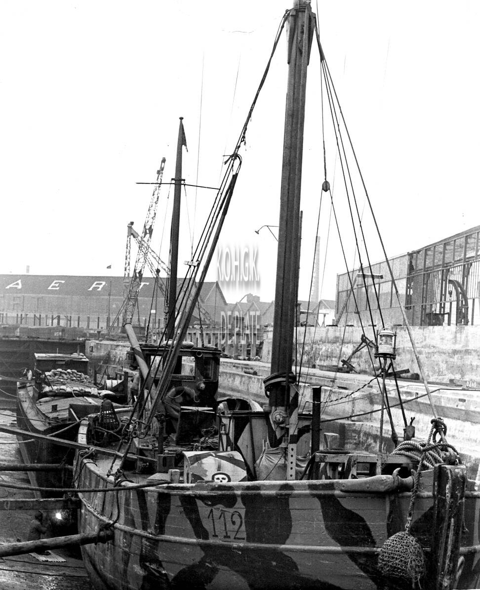 Zicht vanaf de scheepswerf Béliard-Crighton. Een "Vorpostenboot" van de Kriegsmarine aan de kaai van het Zwaaidok nabij de houthandel Snauwaert