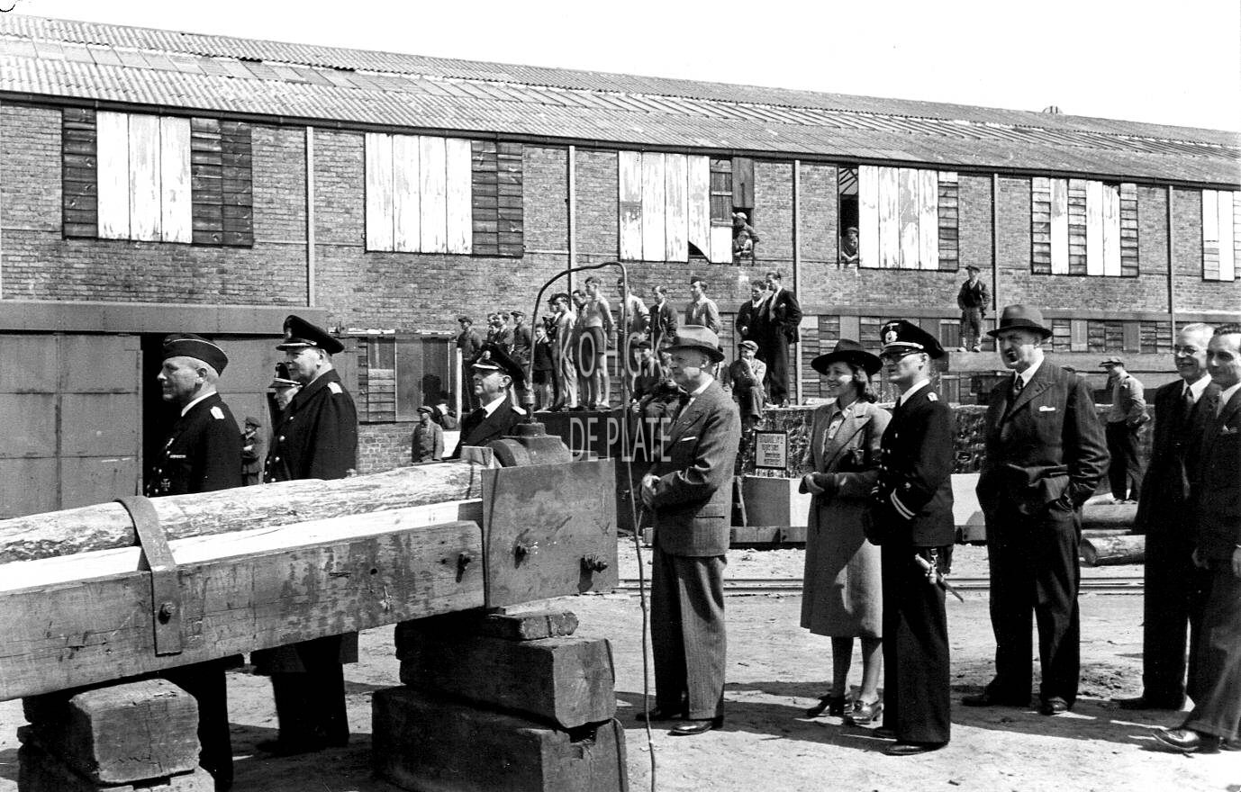 Stapelloop van een "Vorpostenboot" voor de Kriegsmarine, in opdracht van de Hamburgse werf "Norderwerft". Uiterst rechts, drie bestuurleden van Béliard-Crighton, de heren Williams, Fontaine en directeur Chardome. Op de achtergrond, de schrijnwerkerij. - (coll. Bundesarchiv)