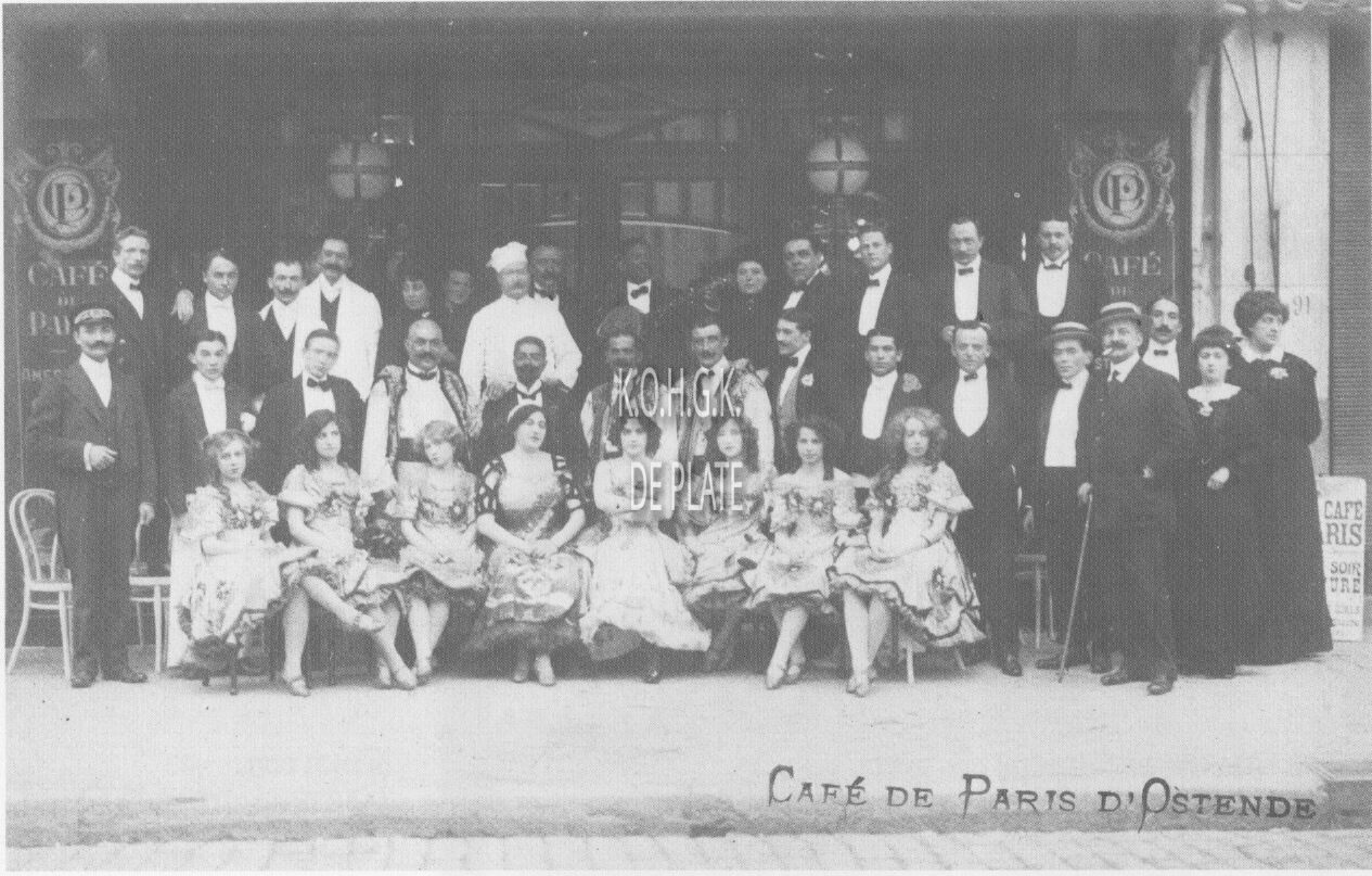 De showartiesten en het personeel van het "Café de Paris" poseren voor de camera. Dit café was gelegen aan de Van Iseghemlaan in het gedeelte tussen de Kursaal-Oosthelling (links) en de Hertstraat (rechts)