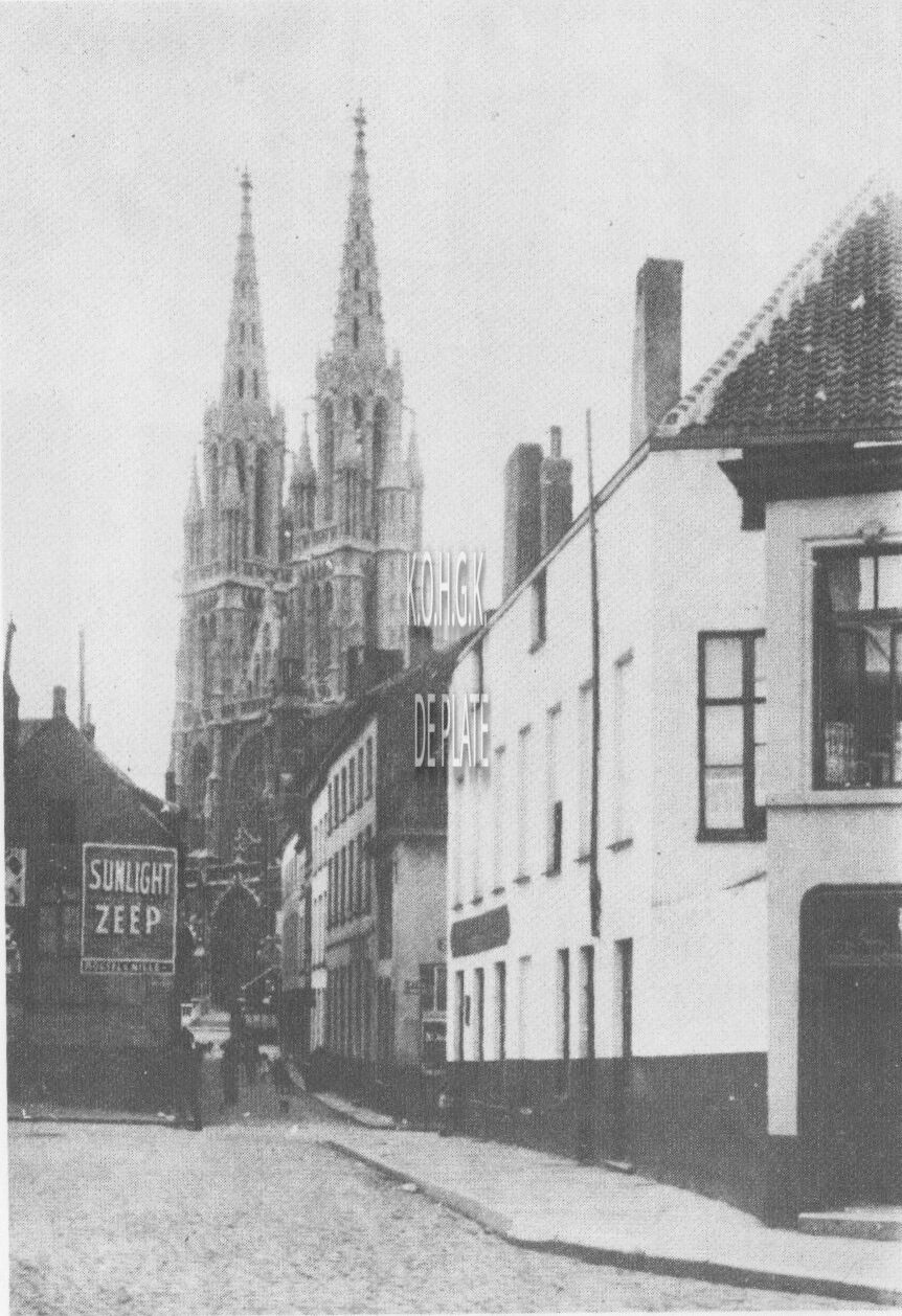 De witte huizen, rechts op de foto, bevonden zich op de plaats van het huidig Pauluspleintje en maakten deel uit van een driehoekig huizenblok de "Driehoek" genaamd. Deze huizen werden tijdens de Eerste Wereldoorlog (1914-1918) zwaar beschadigd en dienden afgebroken te worden. Vooraan de ingangsdeur van de herberg "In de Klippe". Op de achtergrond, richting kerk, de Kleine Kaaistraat, thans Pastoor Pypestraat
