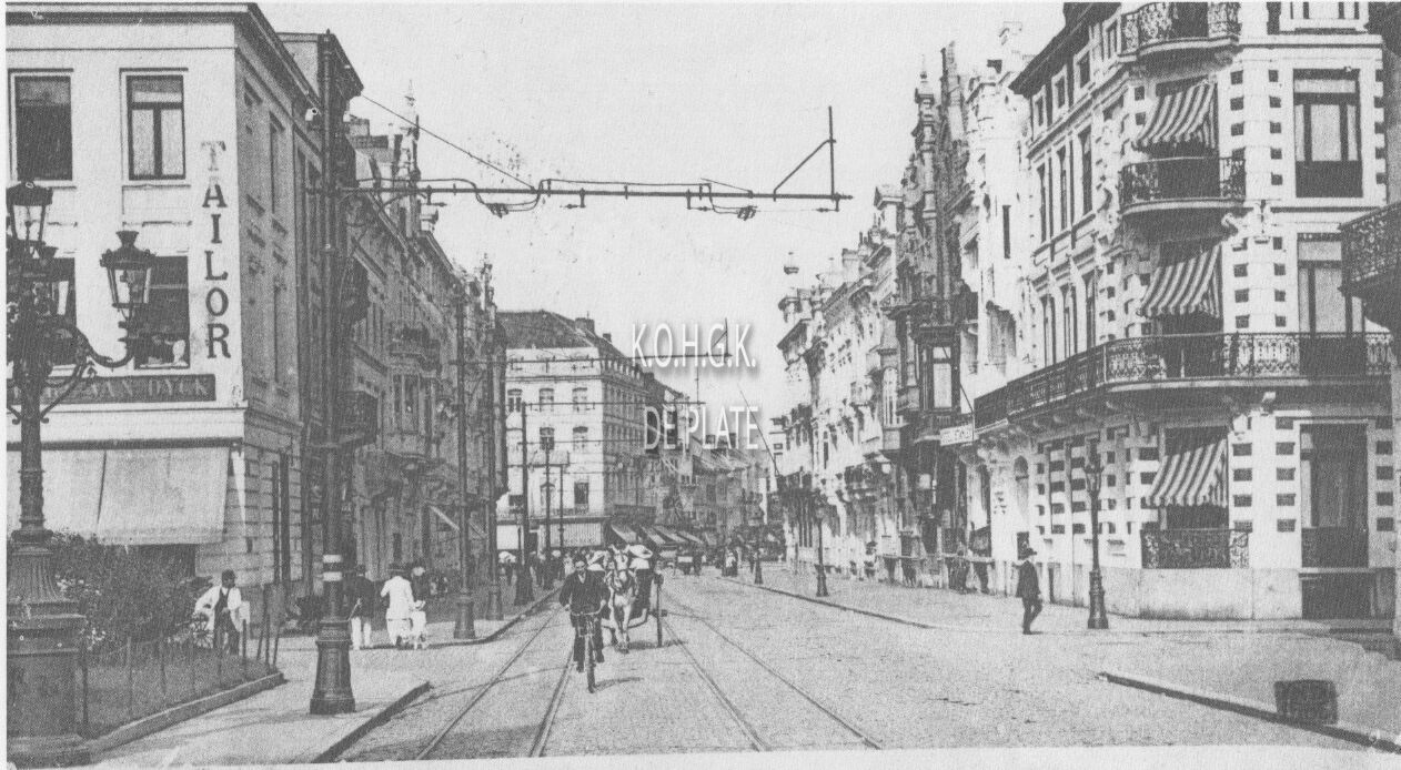Gedeelte van de Koningsstraat gezien vanaf de Ijzerstraat, richting Marie-Joséplein. Centraal op de achtergrond, de Banque Elleboudt, het latere Hotel du Parc