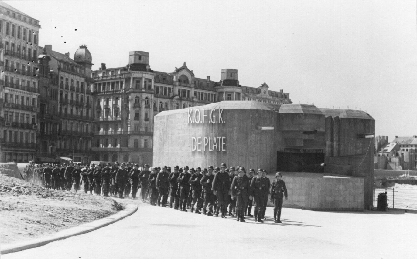 Duitse marineartilleristen marcheren op de Albert I-promenade nabij "Petit Nice". De Kursaal werd afgebroken, een bunker van de Atlantikwall staat er nu. Zomer 1944. (coll. Bundersarchiv)