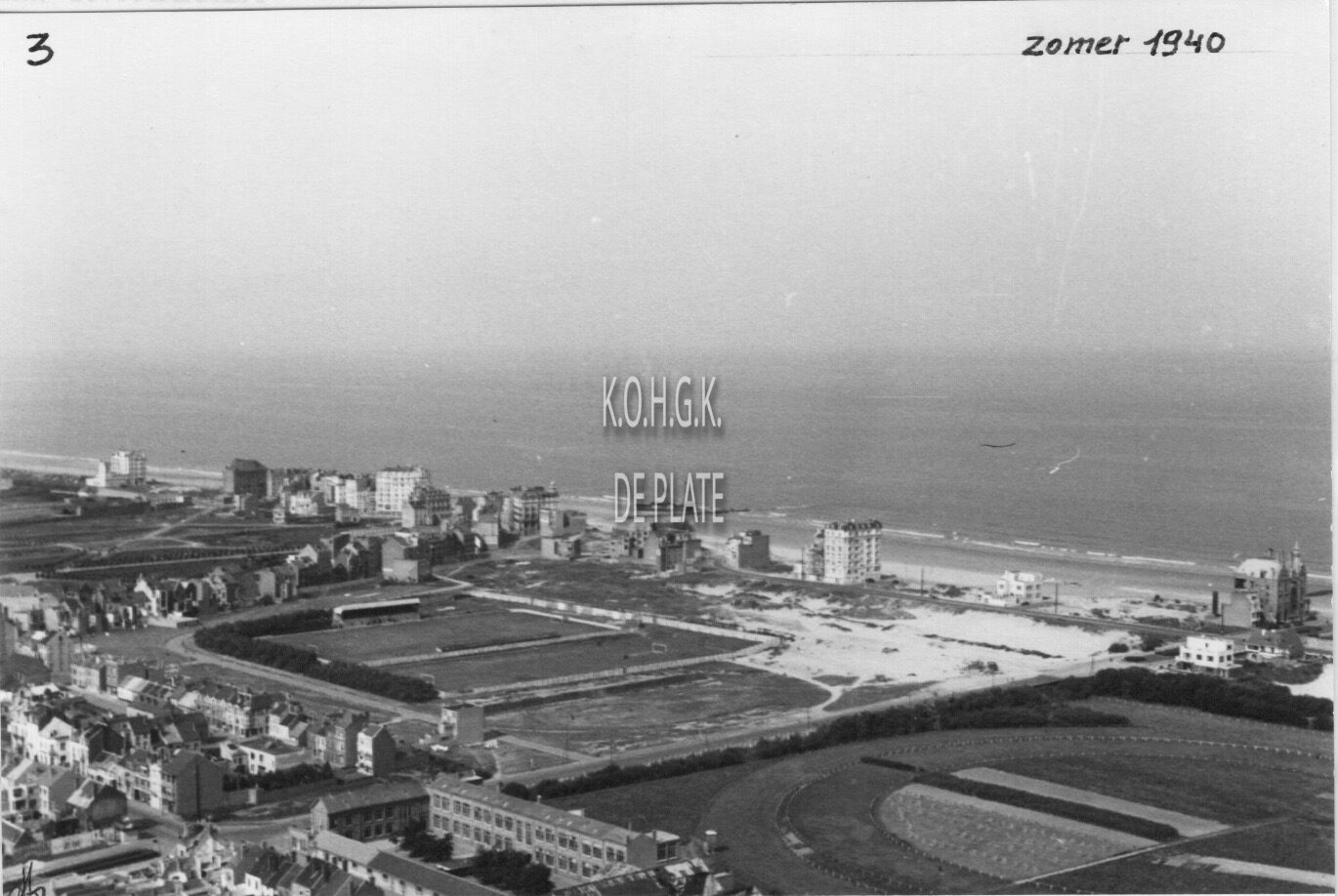 2 foto's : (1) Luchtfoto genomen in de zomder van 1940. We zien vooraan de begraafplaats aan de Nieuwpoortsesteenweg en er achter de Wellingtonrenbaan. De Zeedijk van Mariakerke en links boven op het strand, het gestrande lichtschip "Wandelaar" en (2) Vooraan de stedelijke basisschool Vercamer, rechts, detail van de Wellingtonrenbaan en links, het "Albertpark Stadion" waar ASO voetbal speelde. Achteraan, de Zeedijk van Mariakerke en in het midden van het strand het in mei 1940 gestrande lichtschip "Wandelaar". (coll. Bundesarchiv)