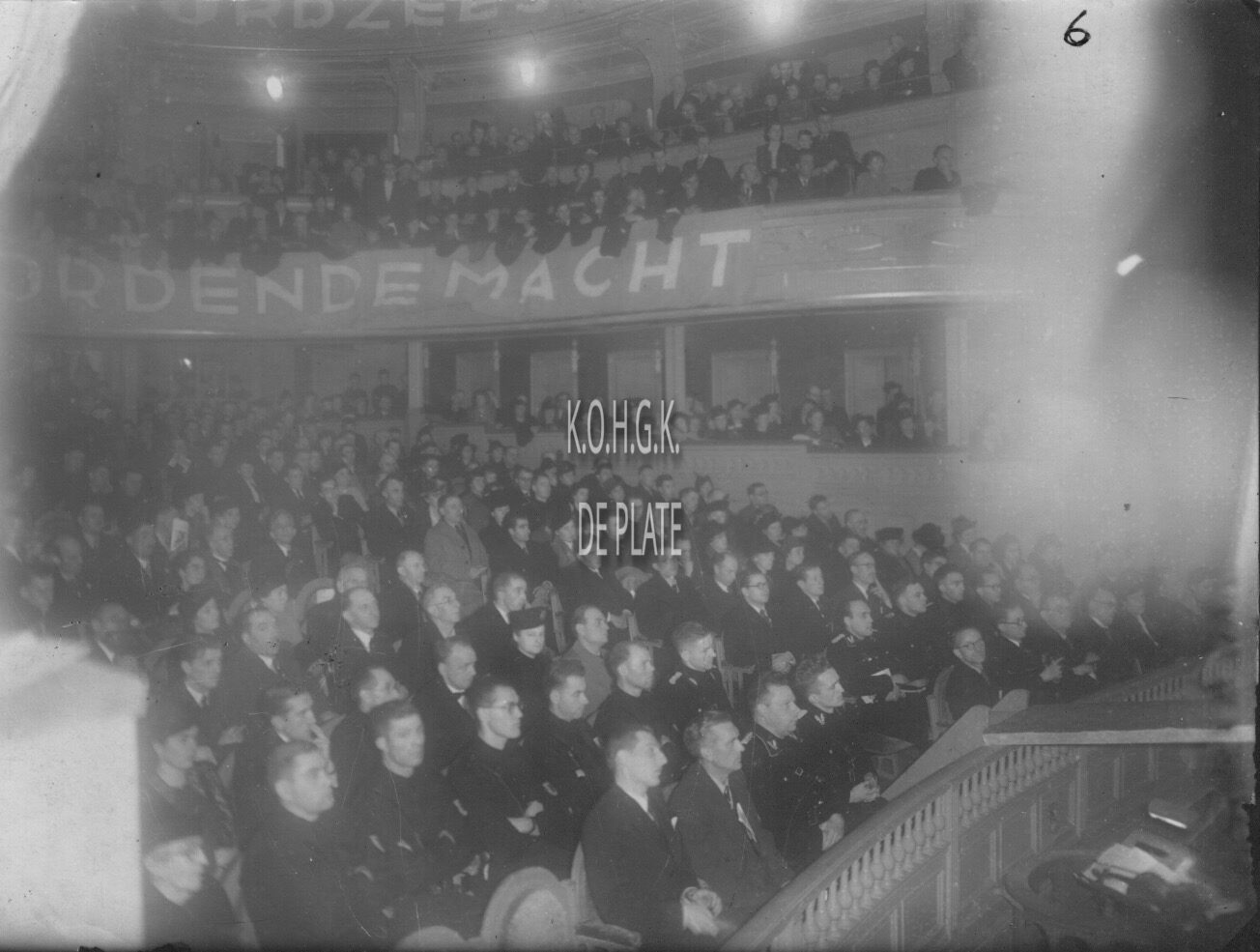 Zondag 7 december 1941. Arrondissementsvergadering in de Koninklijke Schouwburg van het Vlaamsch Nationaal Verbond (VNV) met een toespraak van Staf De Clercq. Ook aanwezig leden van de Zwarte Brigade, met op de eerste rij Joris Vansteenland, hoofd van de Dietsche Militie. Dietsche Militie - Zwarte Brigade was een Vlaamse organisatie van nazigezinde militanten binnen het VNV.