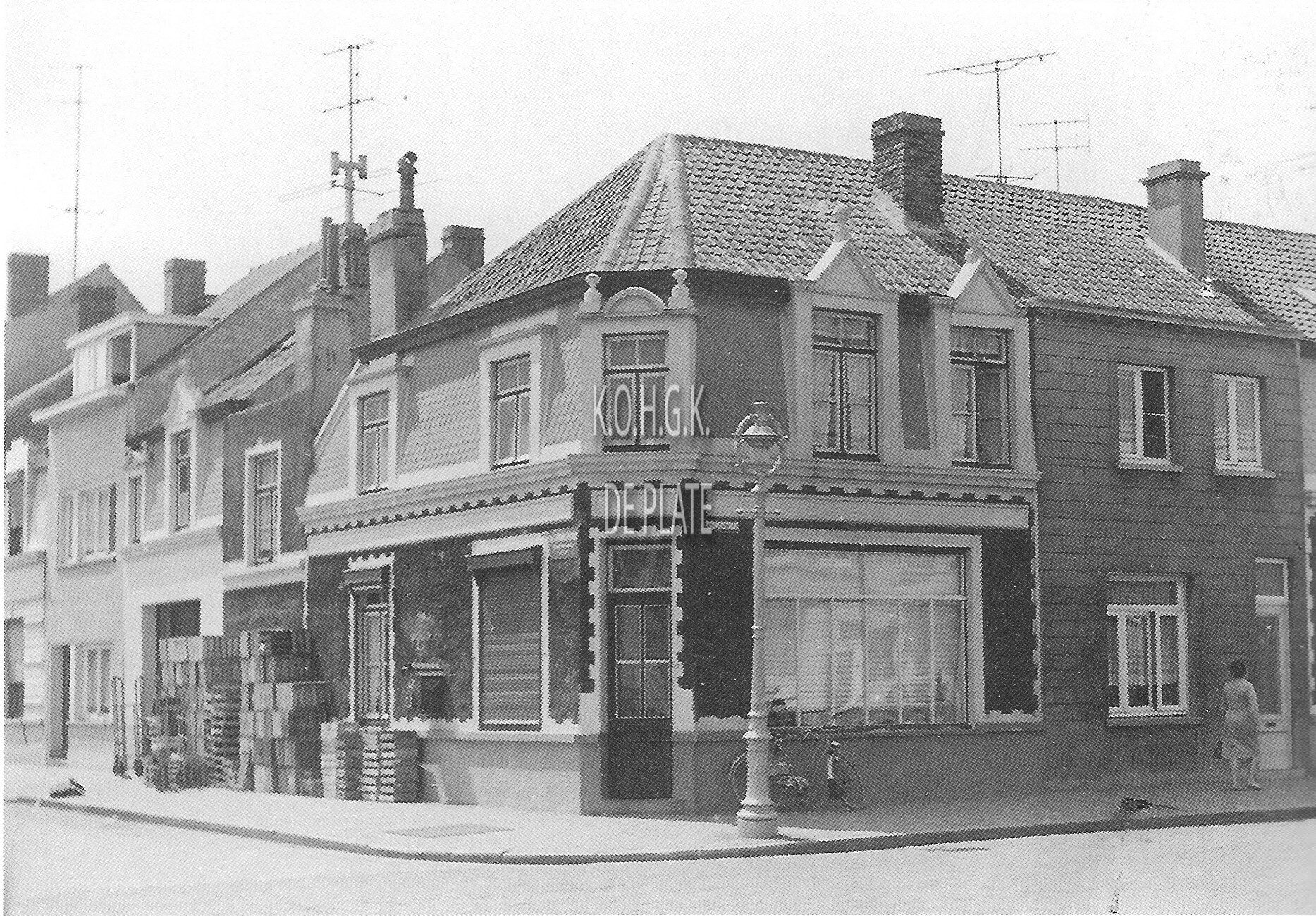 Gedeelte van de Rogierlaan, met bomen, met op de hoek van de Alfons Pieterslaan, het leegstaand café "In de Industrie". Dit gebouw werd rond 1965 gesloopt voor de bouw van een groot modern appartementsgebouw met op het gelijkvloers een apotheek