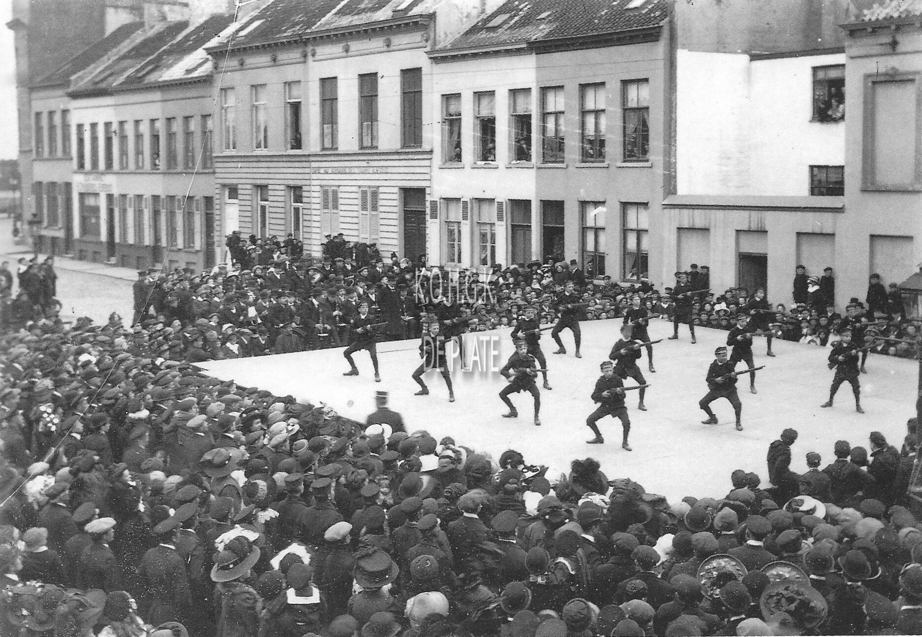 Optreden van de "Turn- en Wapenmaatschappij" op het pleintje aan de Oesterbankstraat. De huizen op de achtergrond zijn gelegen tussen de Slachthuiskaai (links) en de Fregatstraat (rechts)