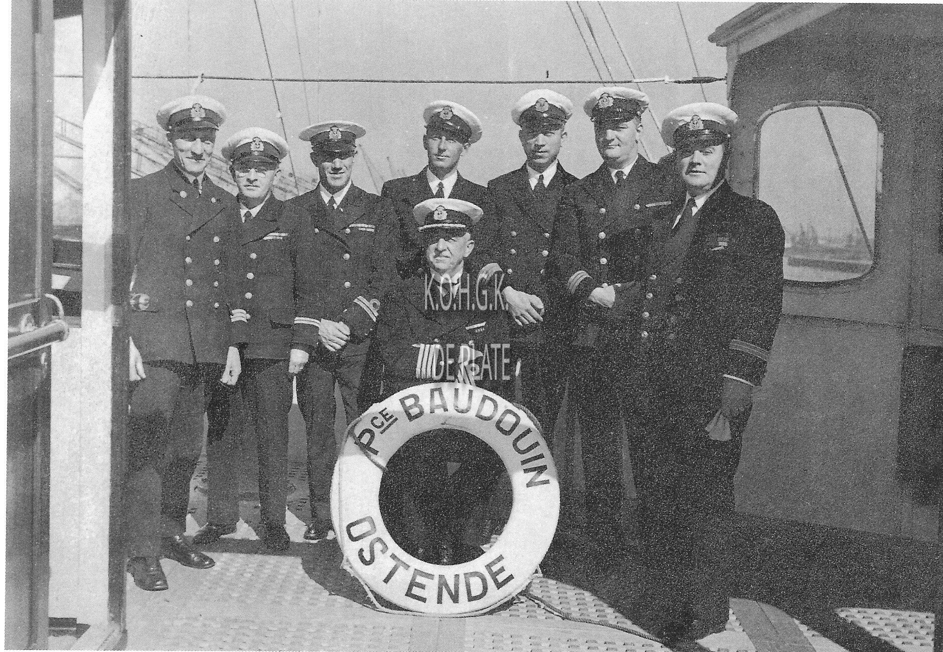 De commandant van de maalboot "Prince Baudouin" poseert met zijn boord-officieren.