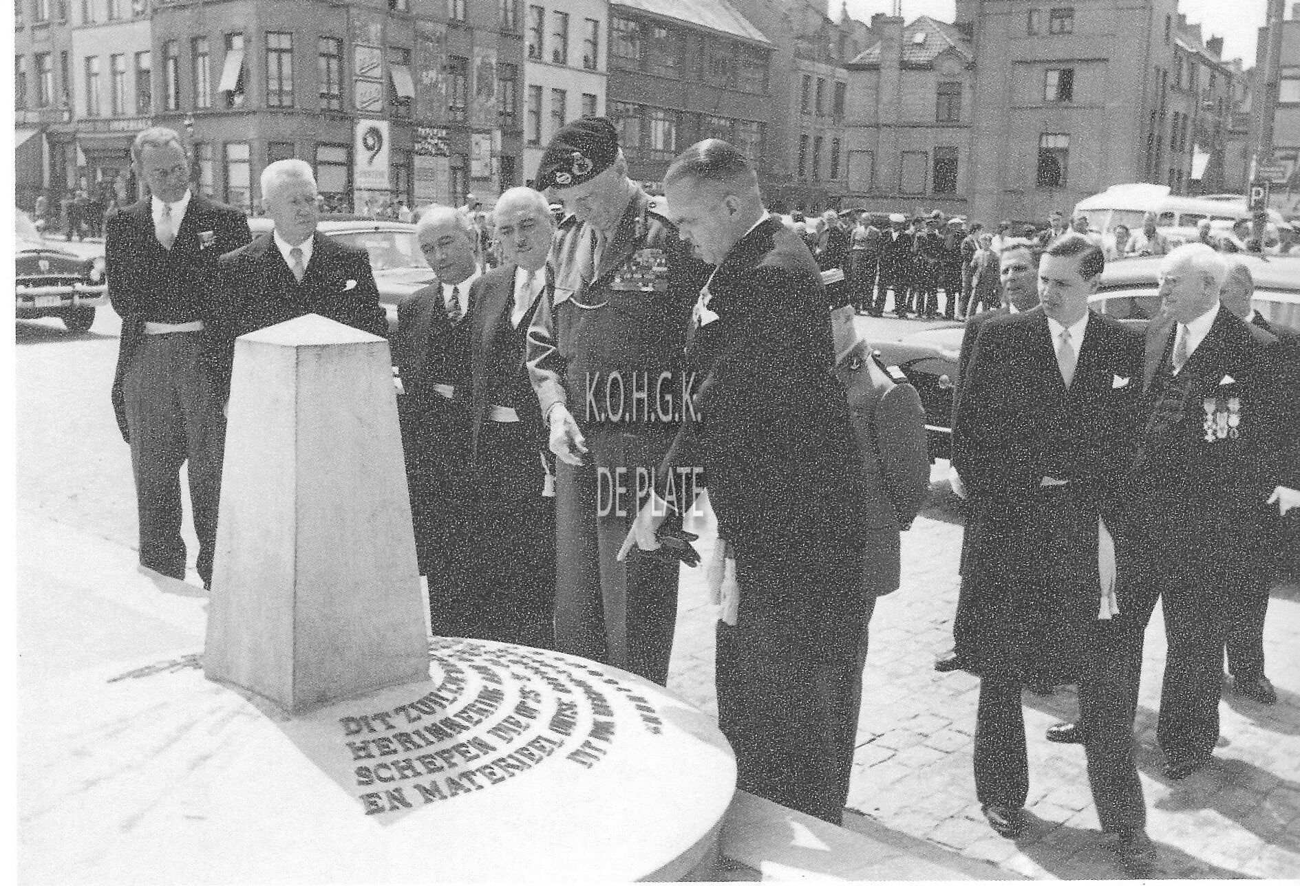 Datum is fout in het boek. Hier tijdens zijn bezoek op 12 juli 1954 bij het herdenkingszuiltje opgericht ter herinnering aan de eerste landingsschepn die op 25 september 1944 in het dok aanlegden om manschappen en materieel te ontschepn ter bevrijding van ons land. We zien hem hier in het gezelschap van burgemeester Adolf Van Glabbeke langs de Visserskaai.