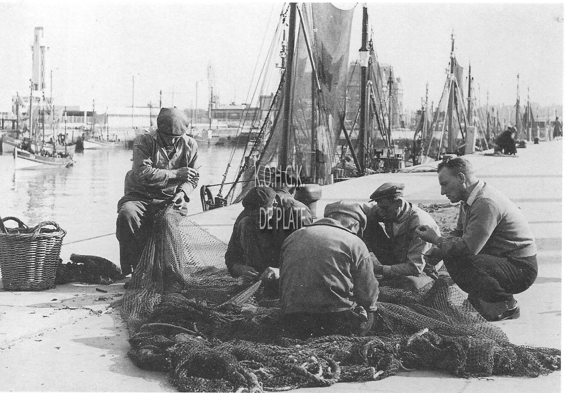 Vissers herstellen hun visnetten op de kade aan de Visserskaai. Ook een beeld dat al lang uit het stadsbeeld verdwenen is !