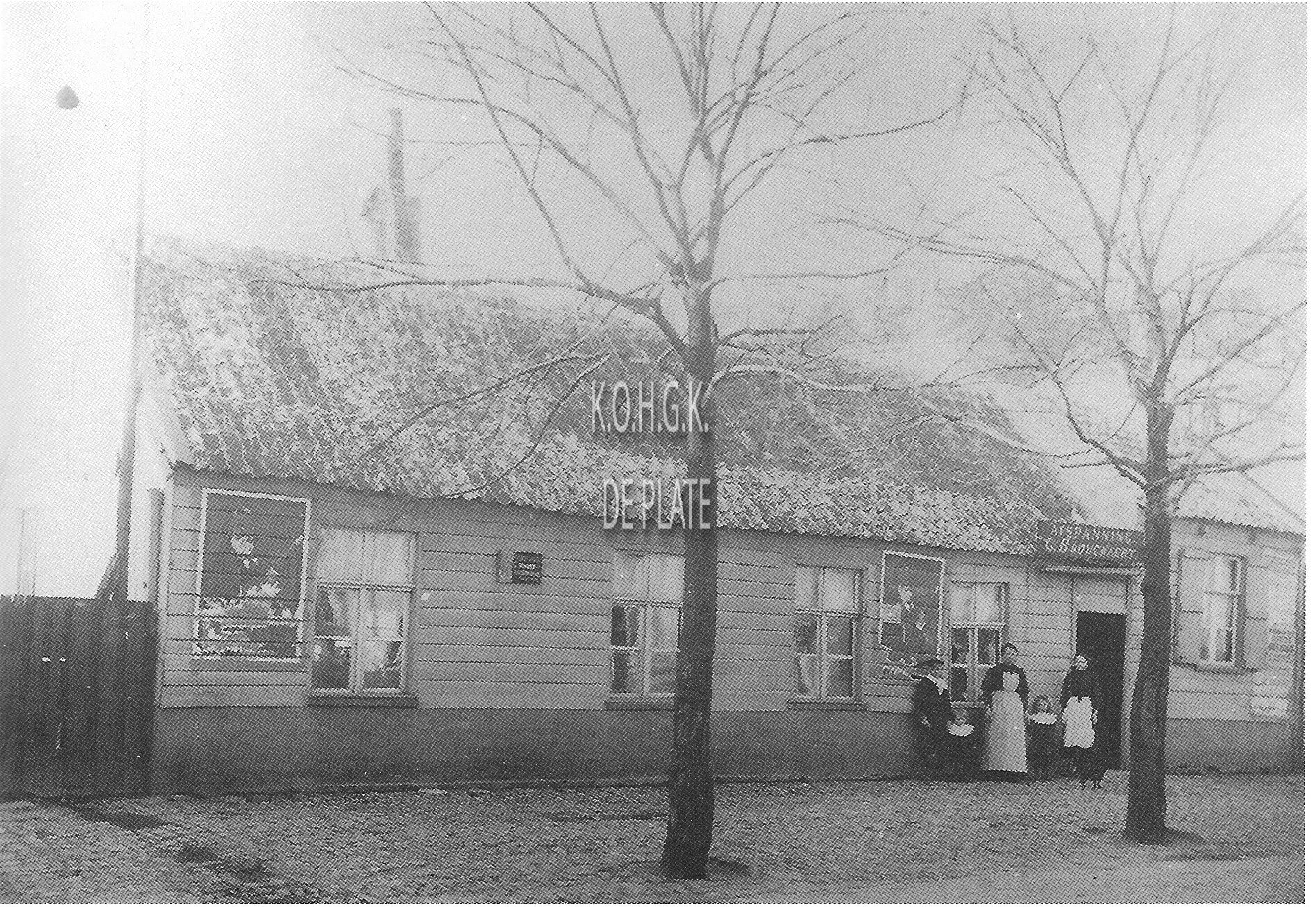 De afspanning van Camiel Brouckaert, gelegen tussen de Muscar- en de Euphrosina Beernaertstraat. Ze was één van de twee, naast elkaar liggende afspanningen, die in de volksmond de "Barlekoten" werden genoemd. Van links naar rechts : Brouckaert Maurice en Madeleine, Declerck Ida, de echtgenote van Camiel, Brouckaert Maria en Rachel.