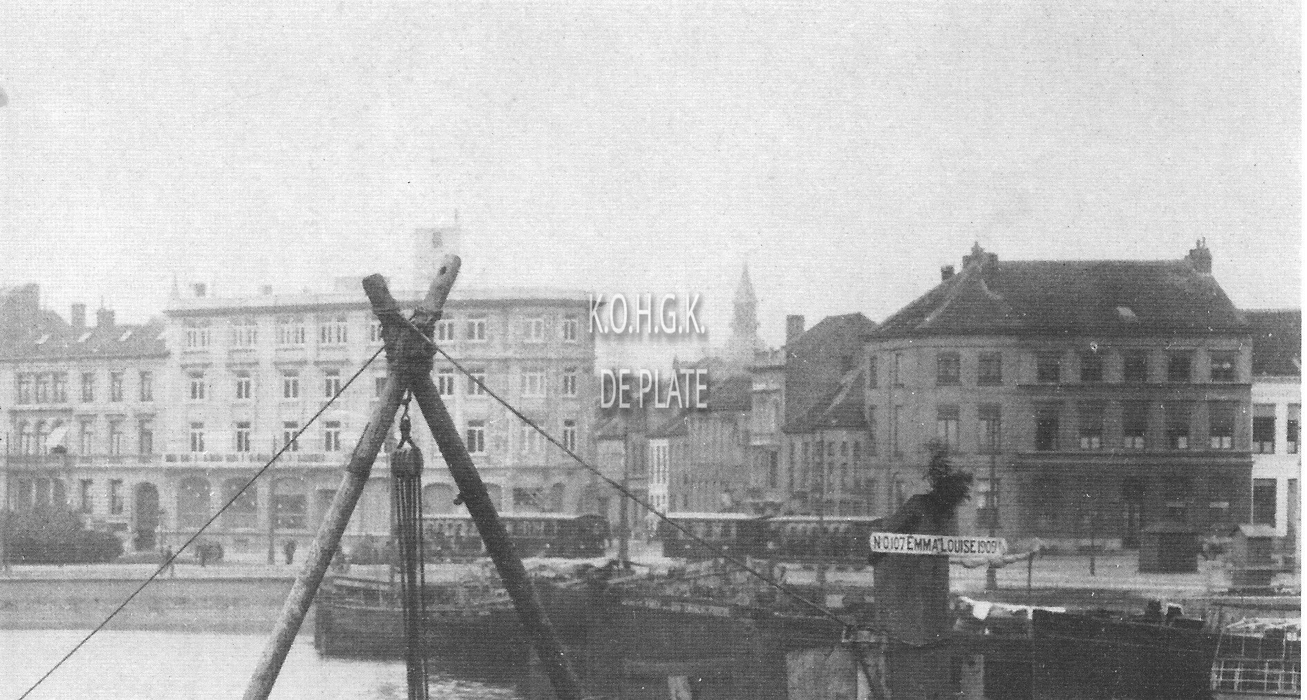 Rechts, het politiecommissariaat, gebouwd in 1905 naar de plannen van architect Gustaaf Vandamme. Op de achtergrond, de Keizerskaai, nu Vindictivelaan, met de huizenrij gelegen tussen de Sint-Joris- en de Zuidstraat. We zien de torens van de Sint Petrus en Pauluskerk (links) en de toren van het Zeevaartcommissariaat, of de Pilotage (rechts).