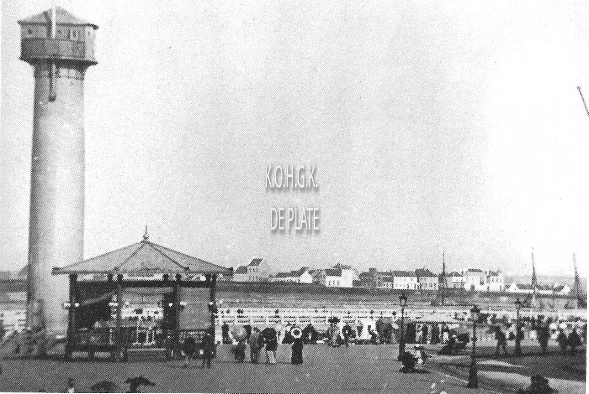 De eerste vuurtoren werd gebouwd in 1771. Ze werd als lichtbaken gebruikt tot einde 1859. Ze stond op de plaats waar thans het "Monument der Zeelieden" staat op het Zeeheldenplein. In de volksmond werd ze de "Vlaggestok" genoemd. Vooraan een verplaatsbare kiosk. Op de achtergron, de huizen van de oude Vuurtorenwijk op de oosteroever.